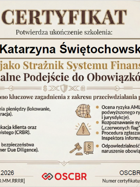 AML Właśnie ukończyłam szkolenie z zakresu AML (przeciwdziałania praniu pieniędzy i finansowaniu terroryzmu).Piszę o tym, ponieważ znajomość procedur oraz właściwa identyfikacja ryzyk mają ogromne znaczenie w naszej codziennej pracy. To właśnie od świadomości zaczyna się bezpiecze...