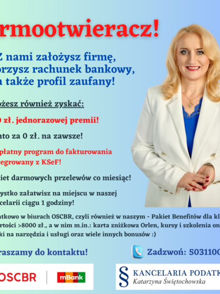 FIRMOOTWIERACZ – pomoc przy otwieraniu działalności gospodarczej Jeśli w najbliższym czasie planujesz otwarcie działalności gospodarczej, informujemy Cię, że dzięki temu, iż nasza Kancelaria jest członkiem OSCBR Ogólnopolska Sieć Certyfikowanych Biur Rachunkowych i współpracuje z m...