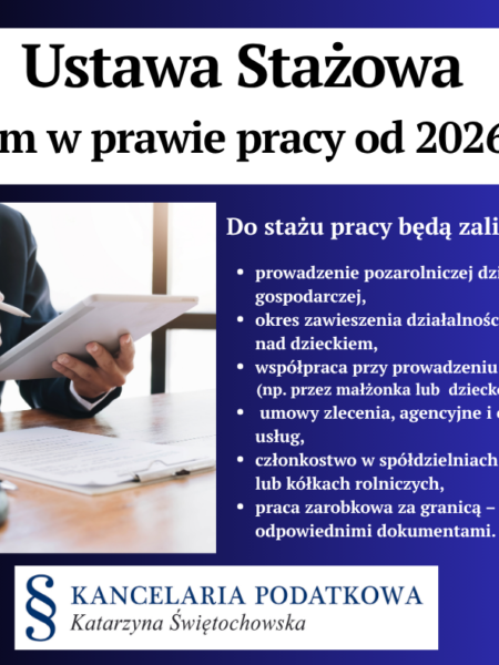 Ustawa Stażowa – przełom w prawie pracy od 2026 roku Na mocy nowej Ustawy Stażowej od 2026 roku zmieni się sposób liczenia stażu pracy w Polsce - do stażu będą wliczane nie tylko lata przepracowane na etacie, ale także inne formy aktywności zawodowej – w tym działalność gospod...