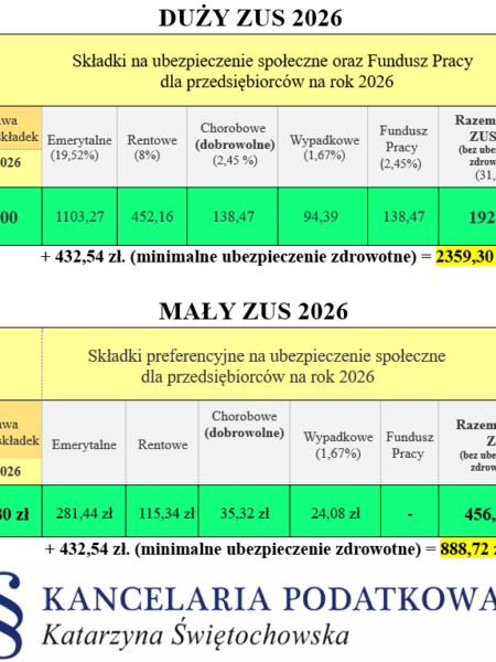 Składki ZUS 2026 – najważniejsze informacje dla przedsiębiorców Duży Zus 2026 – 1926,76 zł.Powyższa kwota obejmuje:- ubezpieczenia społeczne (emerytalne, rentowe, wypadkowe),- dobrowolne ubezpieczenie chorobowe,- Fundusz Pracy – 138,47 zł. Mały ZUS 2026 – 456,18 zł(tzw. ZUS pr...