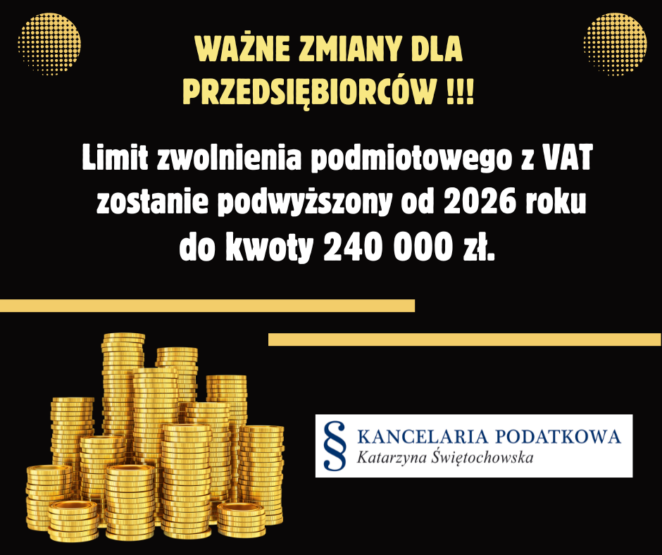 Dobra wiadomość dla przedsiębiorców – od 1 stycznia 2026 r. limit przychodów, do którego można korzystać ze zwolnienia podmiotowego z VAT, wzrośnie do kwoty 240 tys. zł rocznie. Obecnie limit ten wynosi 200 tys. zł.